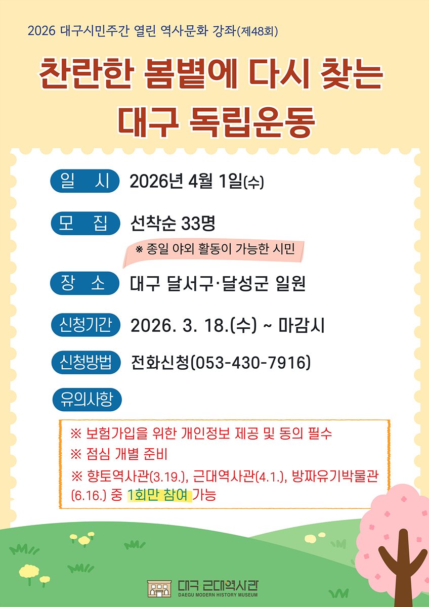 [충청뉴스큐] 대구문화예술진흥원 박물관운영본부 소속 대구근대역사관은 2026 대구시민주간 연계행사로 4월 1일 대구시 달서구와 달성군 일원의 대구 독립운동가와 문화유산을 찾아보는 ‘찬란한 봄볕에 다시 찾는 대구 독립운동’답사를 개최하며 참가자를 모집한다.