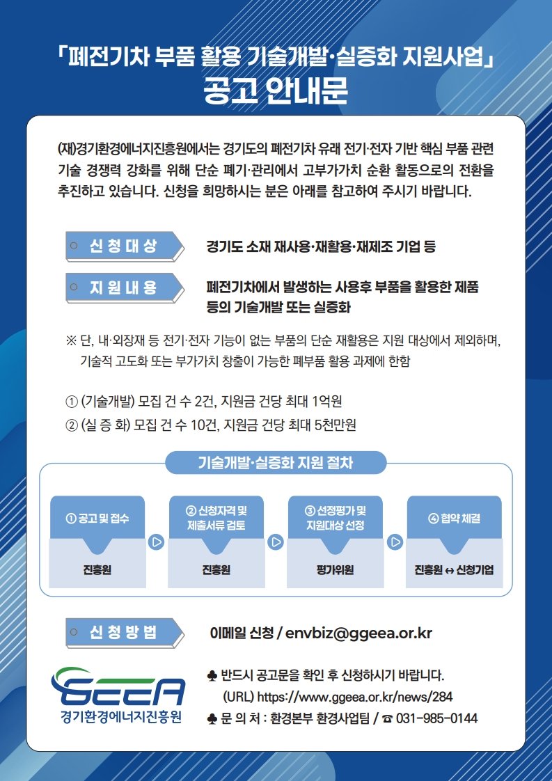 [충청뉴스큐] 경기환경에너지진흥원은 4월 7일까지 ‘2026년 폐전기차 부품 활용 기술개발 및 실증화 지원사업’에 참여할 기업을 모집한다.