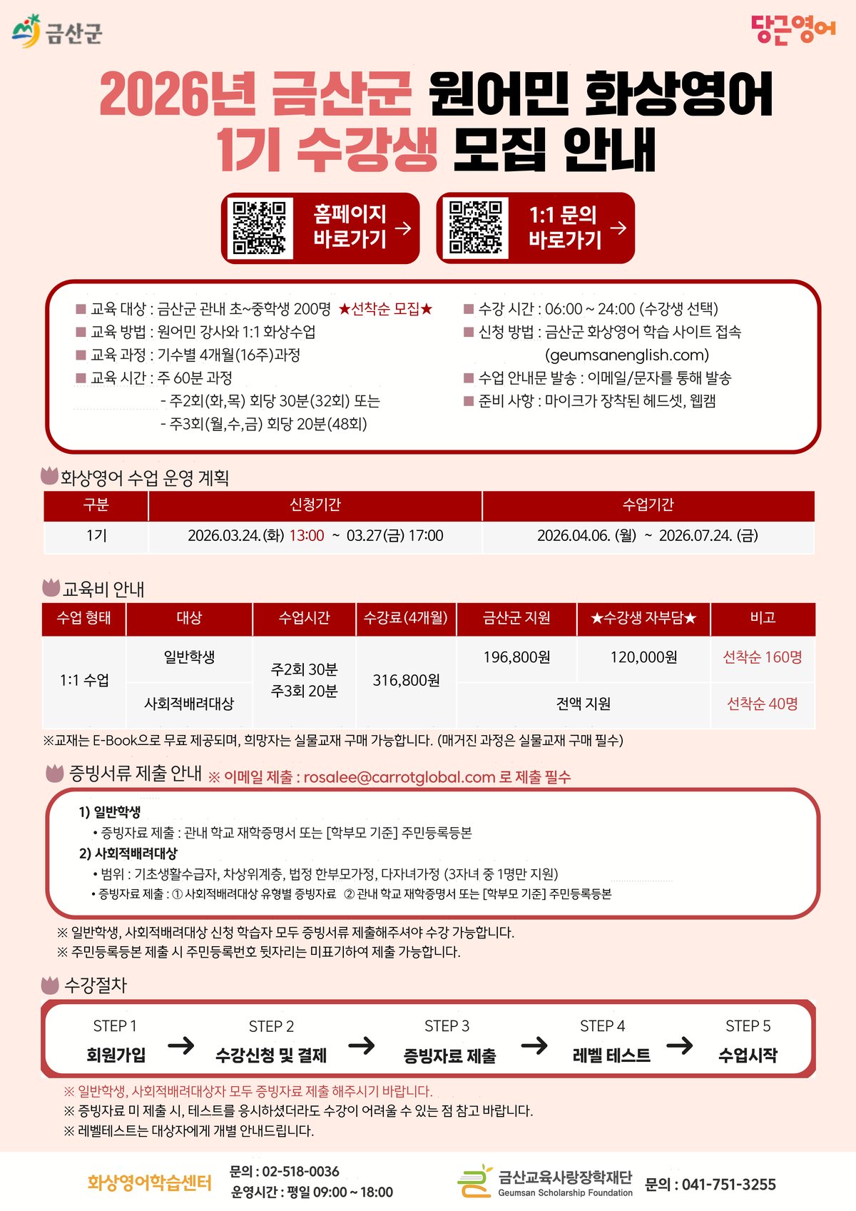 [충청뉴스큐] 금산군은 글로벌 인재양성 및 영어사교육비 절감을 위해 3월 24일부터 27일까지 원어민 화상영어 교육 제1기 수강생 200명을 모집한다.
