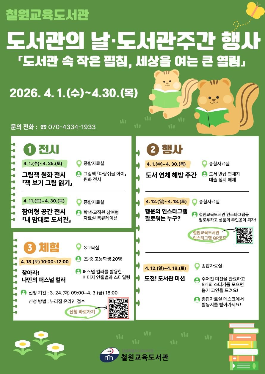 [충청뉴스큐] 철원교육도서관은 4월 12일 도서관의 날과 4월 12일부터 18일까지의 도서관 주간을 맞아 도서관 이용자와 지역 주민들을 대상으로 도서관의 날, 도서관 주간 행사를 운영한다.