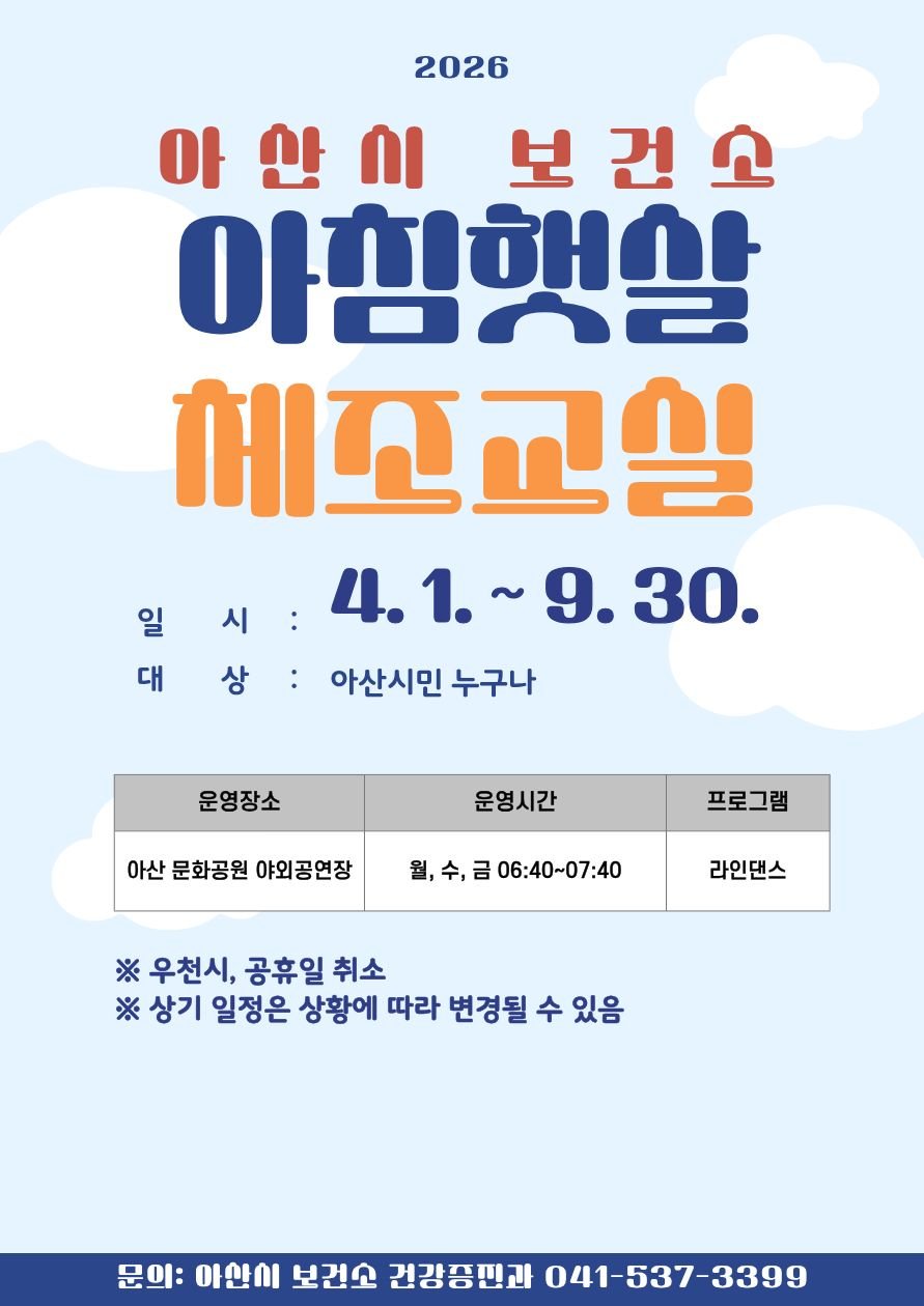 [충청뉴스큐] 아산시보건소는 오는 4월 1일부터 9월 30일까지 시민들의 건강한 일상 실천을 돕기 위해 아침과 저녁 시간대에 ‘2026년 건강체조교실’을 운영한다.