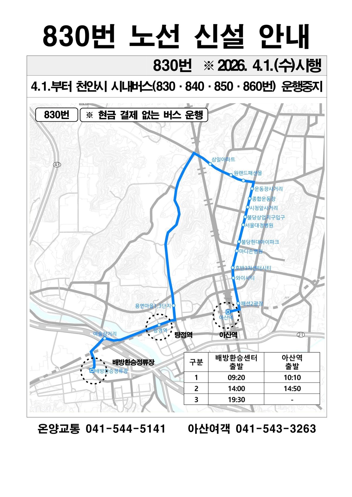 830번: 배방환승정류장-탕정역-삼일원앙아파트-천안시청앞사거리-아산역 840번: 배방환승정류장-아산역-천안시청앞사거리-삼일원앙아파트-아산스마트밸리 860번: 배방환승정류장-탕정역-홍익아파트-삼일원앙아파트-천안 시청앞사거리-아산역 시는 이번 노선 신설을 통해 천안시 노선 운행 중지에 따른 교통 공백 최소화 음봉 아산스마트밸리 접근성 강화 천안시 주요 거점 경유 등 시민 이동 편의 증진에 기여할 것으로 내다보고 있다.