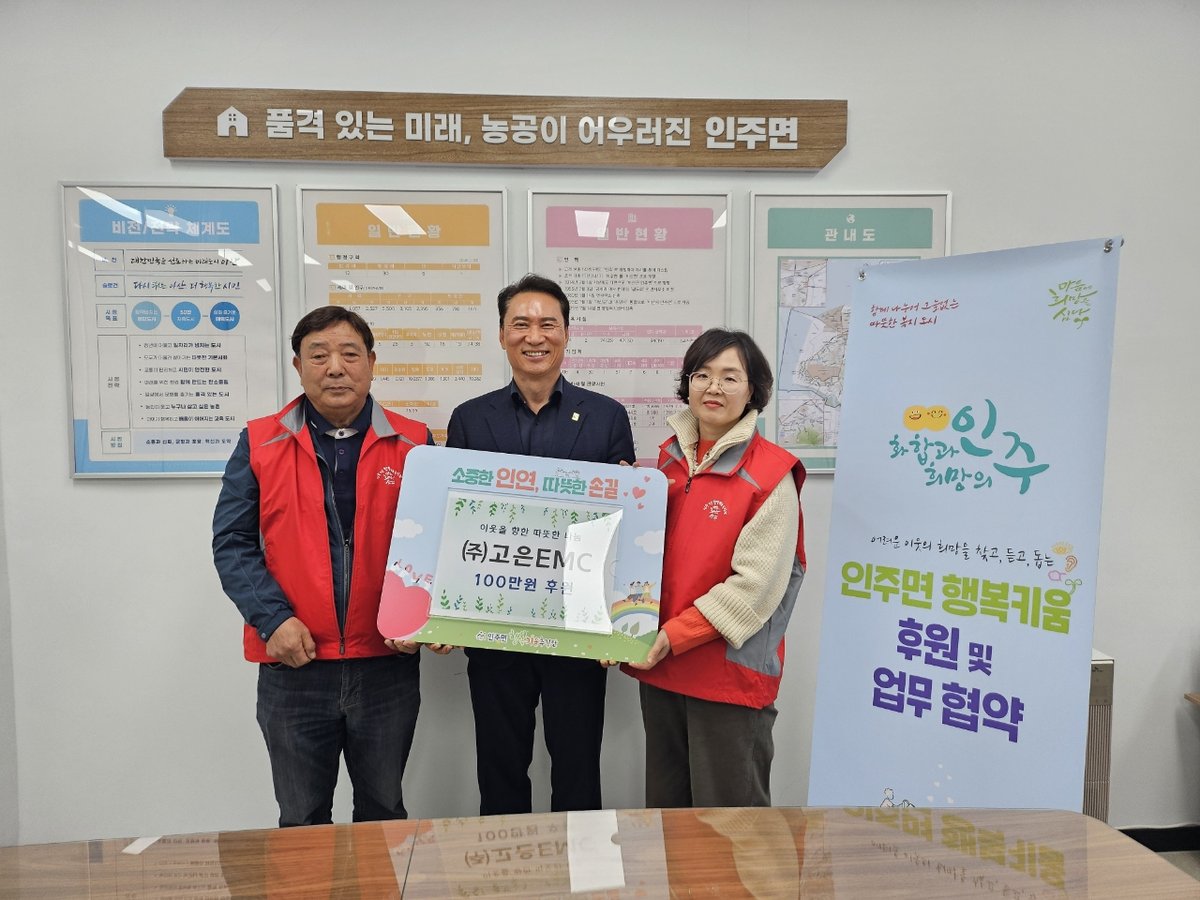 [충청뉴스큐] 아산시 인주면 행복키움추진단은 지난 19일 고은EMC로부터 저소득층 지원을 위한 후원금 100만원을 전달받았다.