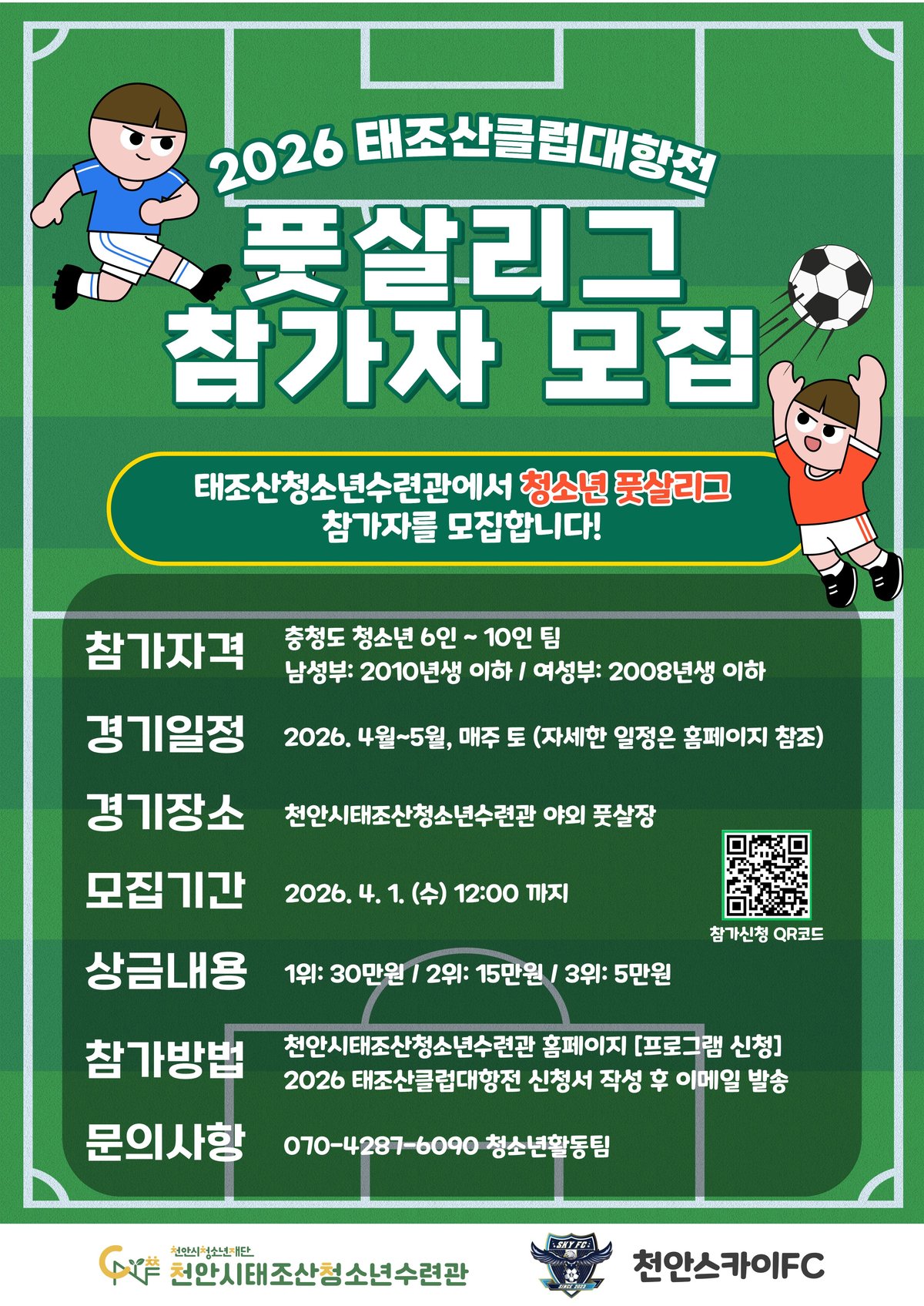 [충청뉴스큐] 천안시청소년재단 산하 천안시태조산청소년수련관은 청소년의 건강한 여가 활동과 스포츠 참여 기회를 확대하기 위해 ‘2026 태조산 클럽대항전 풋살리그’ 참가팀을 모집한다고 20일 밝혔다.