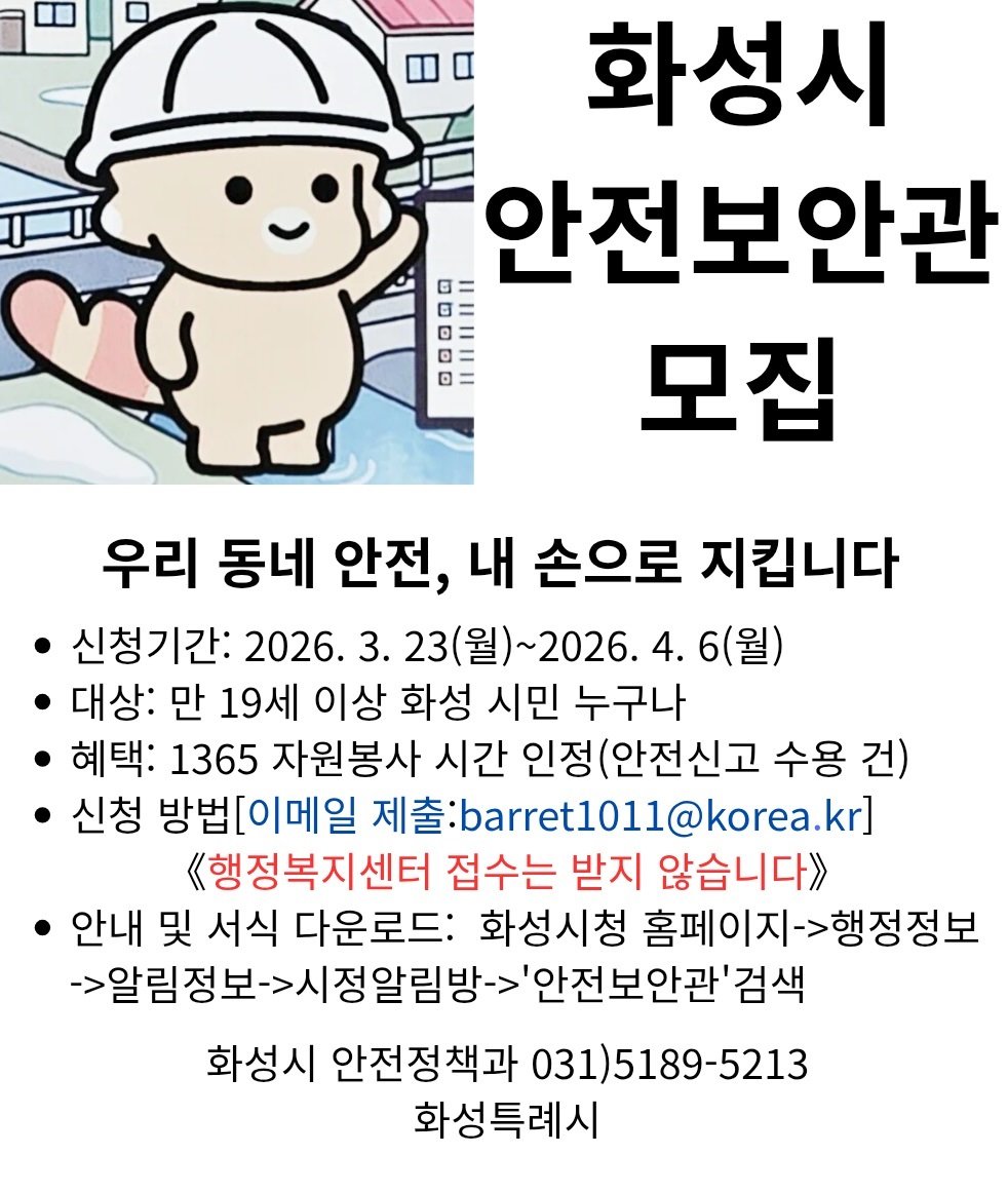 [충청뉴스큐] 화성특례시는 지역 내 안전문화 확산과 생활 속 위험요소의 사전 발굴 제거를 위해 안전보안관 145명을 공개 모집한다고 23일 밝혔다.