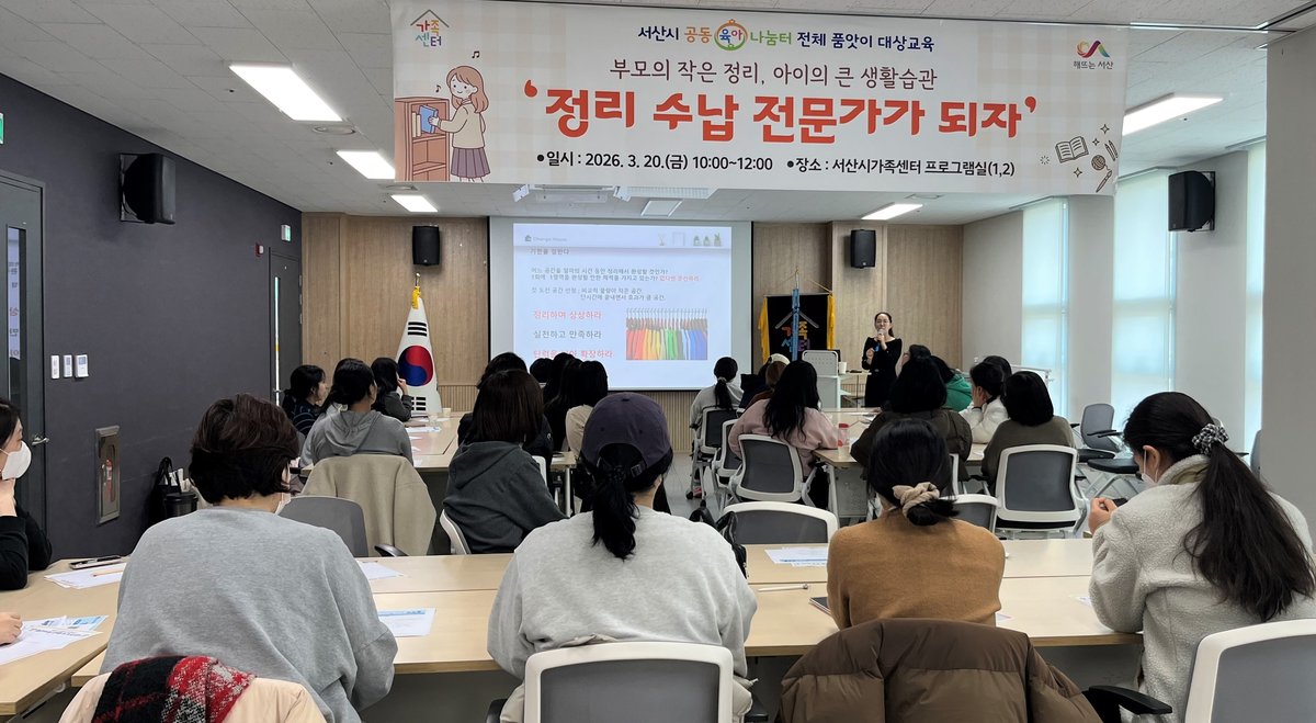 이번 교육은 서산시 공동육아나눔터 4개호점 공동진행으로 부모가 먼저 실천하는 정리수납 방법을 배우고 이를 가정에서 적용할 수 있도록 돕기 위해 마련됐다.