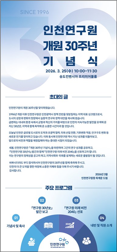[충청뉴스큐] 인천연구원은 2026년 3월 25일 오전 10시, 송도컨벤시아 프리미어볼룸에서 ‘인천연구원 개원 30주년 기념식’을 개최한다.