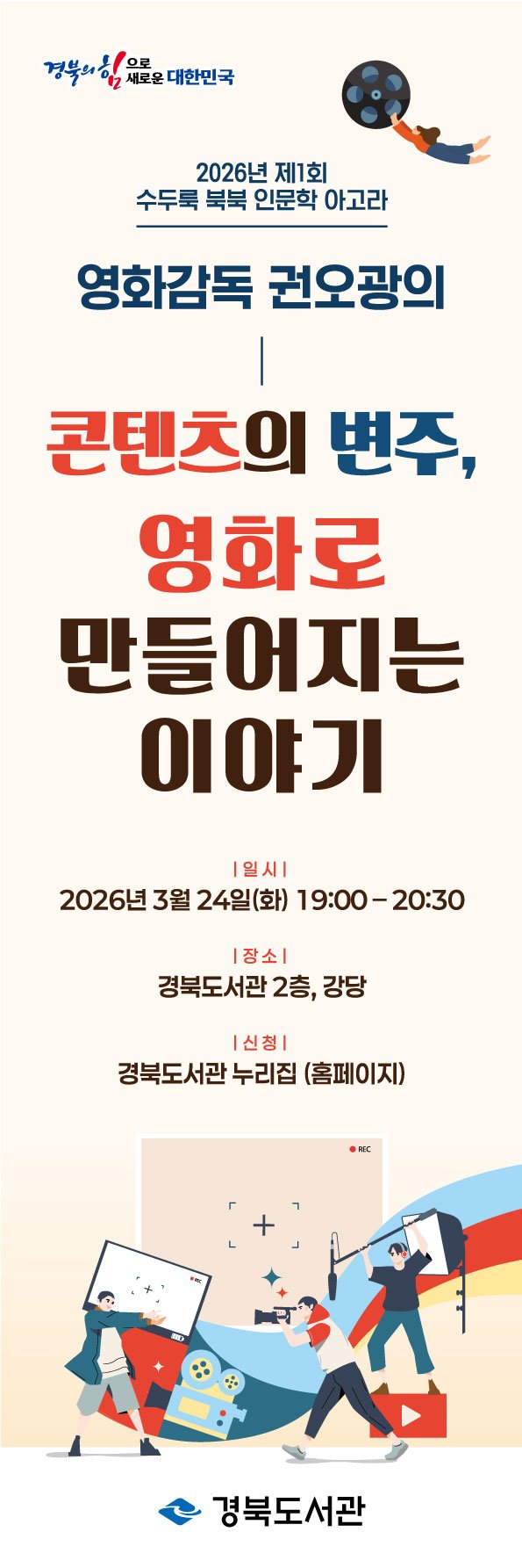 박세진 경북도서관장은 "수두룩 북북 인문학 아고라는 단순히 지식을 전달하는 강의를 넘어, 지역 예술가와 도민이 직접 만나 사유의 지평을 넓히는 장"이라며 "영화라는 매체를 통해 도민들의 인문학적 소양을 넓히고 문화 향유 기회를 확대하는 계기가 되길 기대한다"고 전했다.