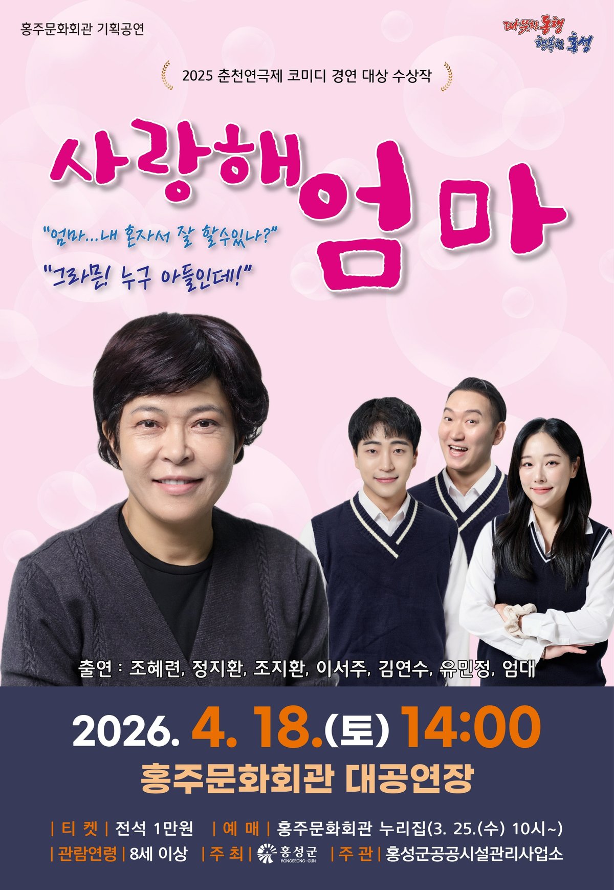 [충청뉴스큐] 홍성군은 가족의 소중함을 담은 휴먼스토리 ‘사랑해 엄마’를 4월 18일 오후 2시 홍주문화회관 대공연장 무대에 올린다.