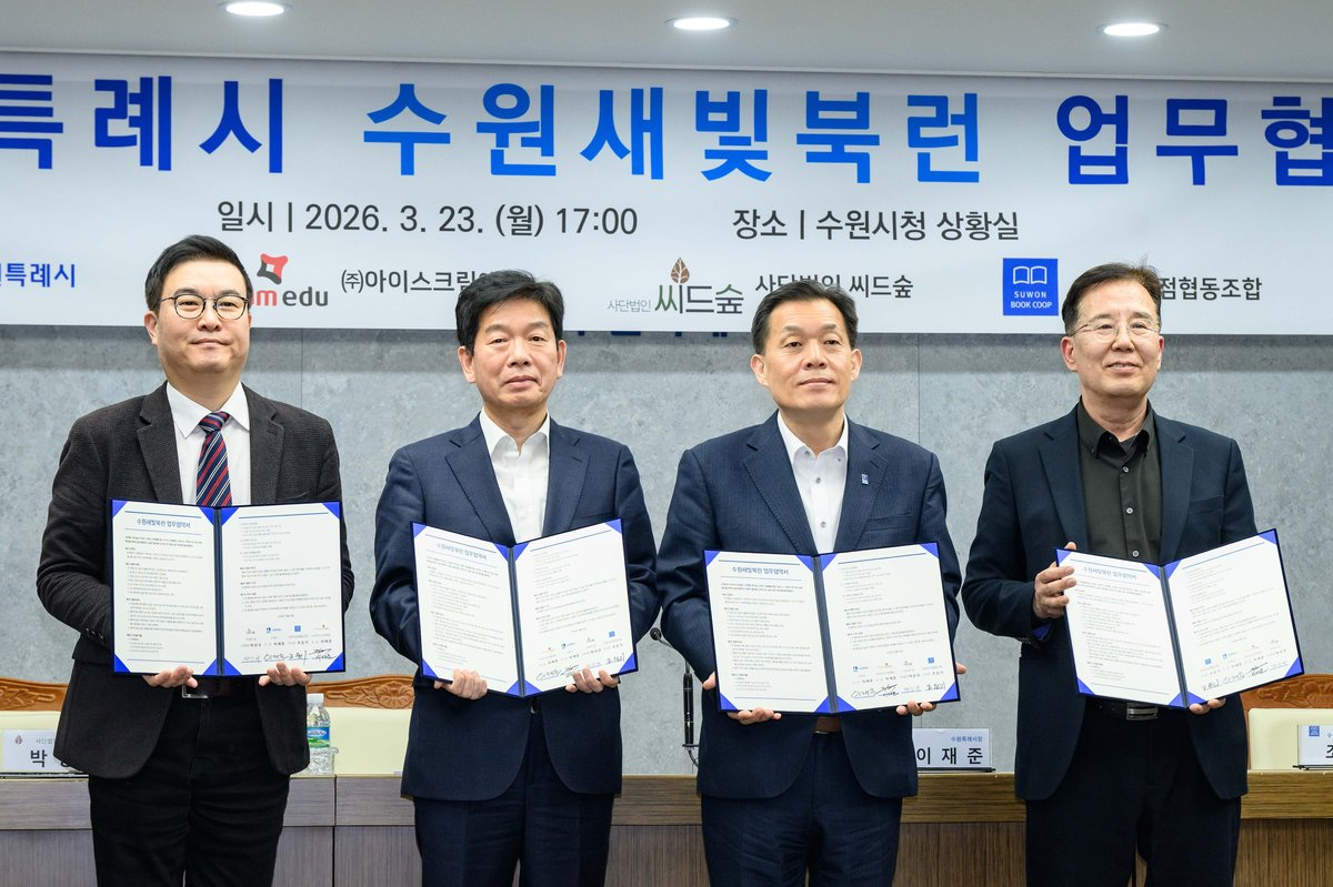 수원시와 아이스크림에듀,씨드숲, 수원시서점협동조합은 23일 시청 상황실에서 ‘수원새빛북런 업무협약’을 체결하고 협력을 약속했다.