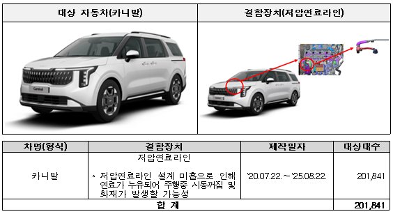 ① 카니발 201,841대는 저압연료라인 설계 미흡으로 인해 연료가 누유되어 주행중 시동꺼짐 및 화재가 발생할 가능성으로 3월 25일부터 시정조치에 들어간다.