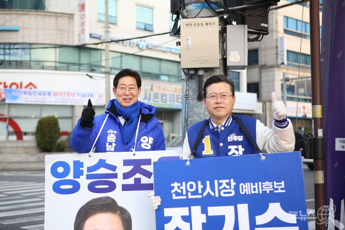 양승조 더불어민주당 도지사 예비후보와 장기수 천안시장 예비후보가 24일 천안에서 아침 공동 선전전과 간담회를 진행하며 상호 지지와 협력을 다짐했다.