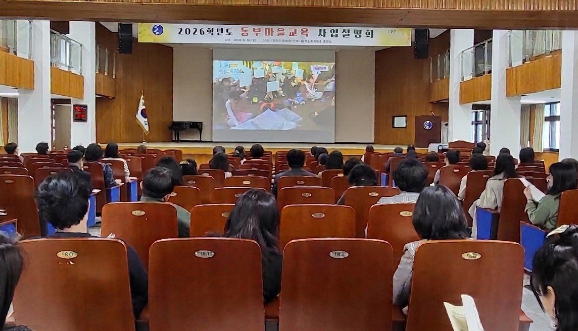 [충청뉴스큐] 마을과 학교 잇는'행복이음'공유의 장 마련 - 2026학년도 동부마을교육 사업설명회 - 대전동부교육지원청은 3월 24일 대전동부교육지원청 대강당에서 관내 초 중 고 마을교육 업무담당자 및 희망 교원 100명을 대상으로 '2026학년도 동부마을교육 사업설명회'를 개최했다고 밝혔다.