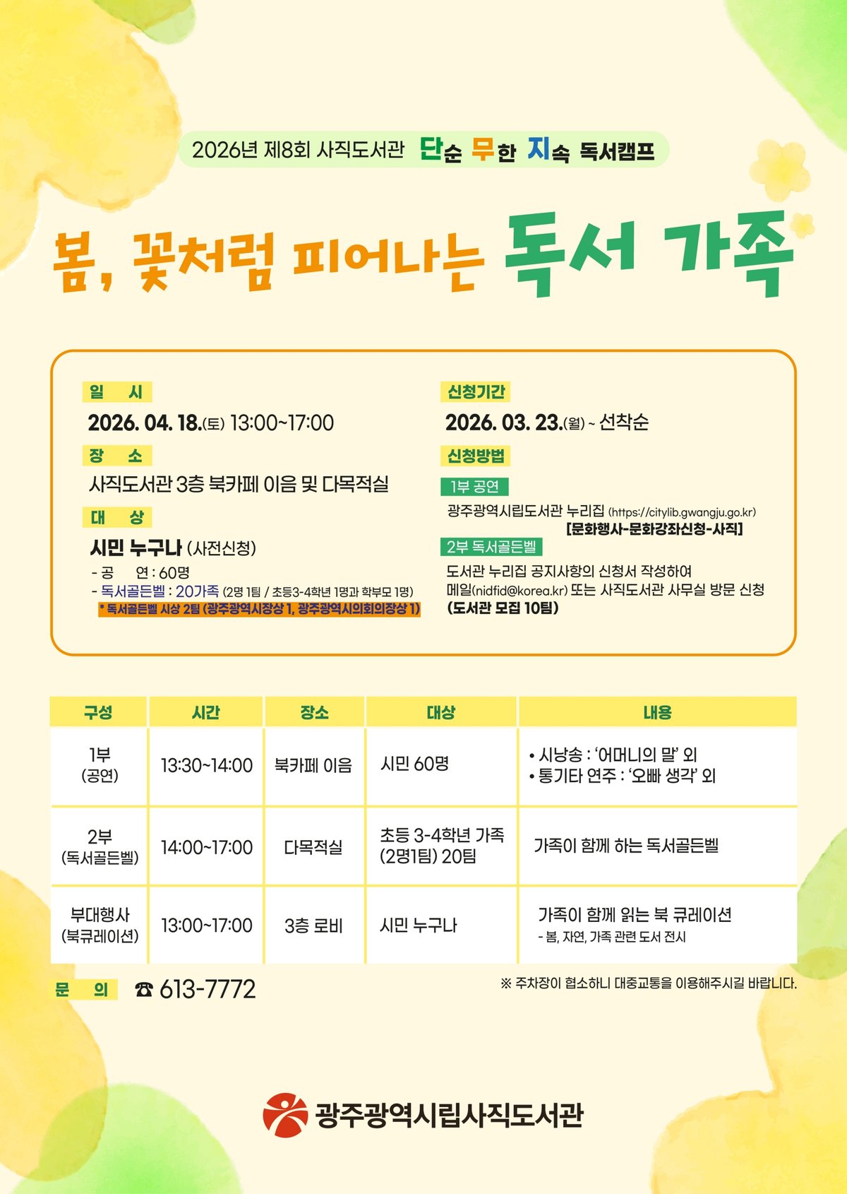 이 행사는 ‘봄, 꽃처럼 피어나는 독서 가족’을 주제로 가족이 책을 통해 소통하며 독서의 즐거움을 나누고 도서관 중심의 가족 독서 문화를 확산하기 위해 마련했다.