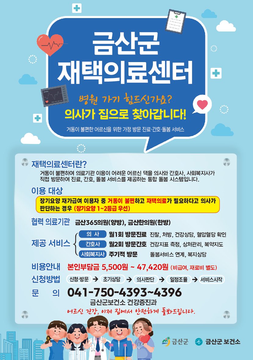 보건소 관계자는 "거동이 불편해 병원 이용이 어려운 어르신들이 집에서도 필요한 의료서비스를 받을 수 있도록 재택의료센터 프로그램을 진행할 것"이라며 "읍면 행정복지센터와 긴밀히 협력해 대상자를 적극 발굴함으로써 통합돌봄지원법 시행에 맞춰 지역 중심 돌봄체계를 안정적으로 운영해 나가겠다"고 말했다.