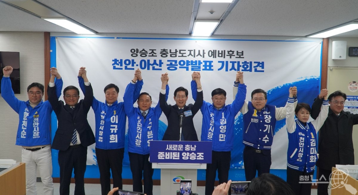 이날 기자회견에는 더불어민주당 천안시장 예비후보들이 자리를 함께했다. 구본영·김미화·김영만·이규희·장기수·최재용·한태선·황천순 예비후보 등 8명이 도지사 후보와 한 자리에 섰다. 천안시장을 놓고 치열하게 경쟁 중인 이들이 나란히 자리한 것은 천안 민주당의 결집을 상징하는 장면으로 평가된다.