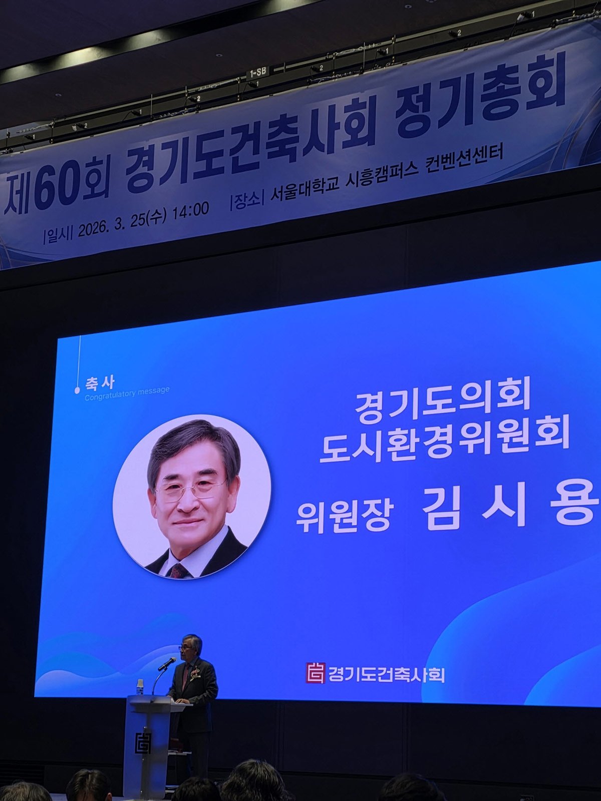 [충청뉴스큐] 경기도의회 도시환경위원회 김시용 위원장은 25일 경기도건축사회 제60회 정기총회에 참석해 건축 분야 발전을 위해 헌신해 온 관계자들에게 감사와 격려의 뜻을 전했다.