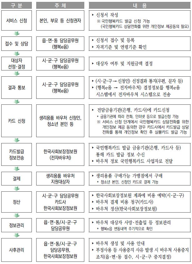 지원받은 바우처는 청소년 본인 또는 보호자 명의의 국민행복카드를 통해 카드사별로 지정된 온 오프라인 유통점에서 생리용품을 구매하는 데 사용할 수 있다.