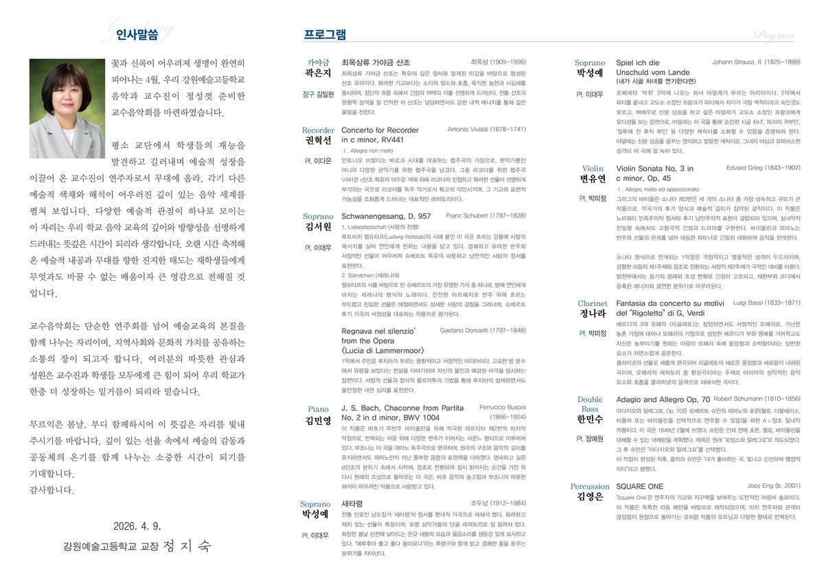 정지숙 교장은 "아름다운 소리의 향이 음악회에 함께하시는 모든 분의 마음과 삶 가운데 행복의 시간으로 가득 채워질 수 있기를 바란다"라고 말했다.