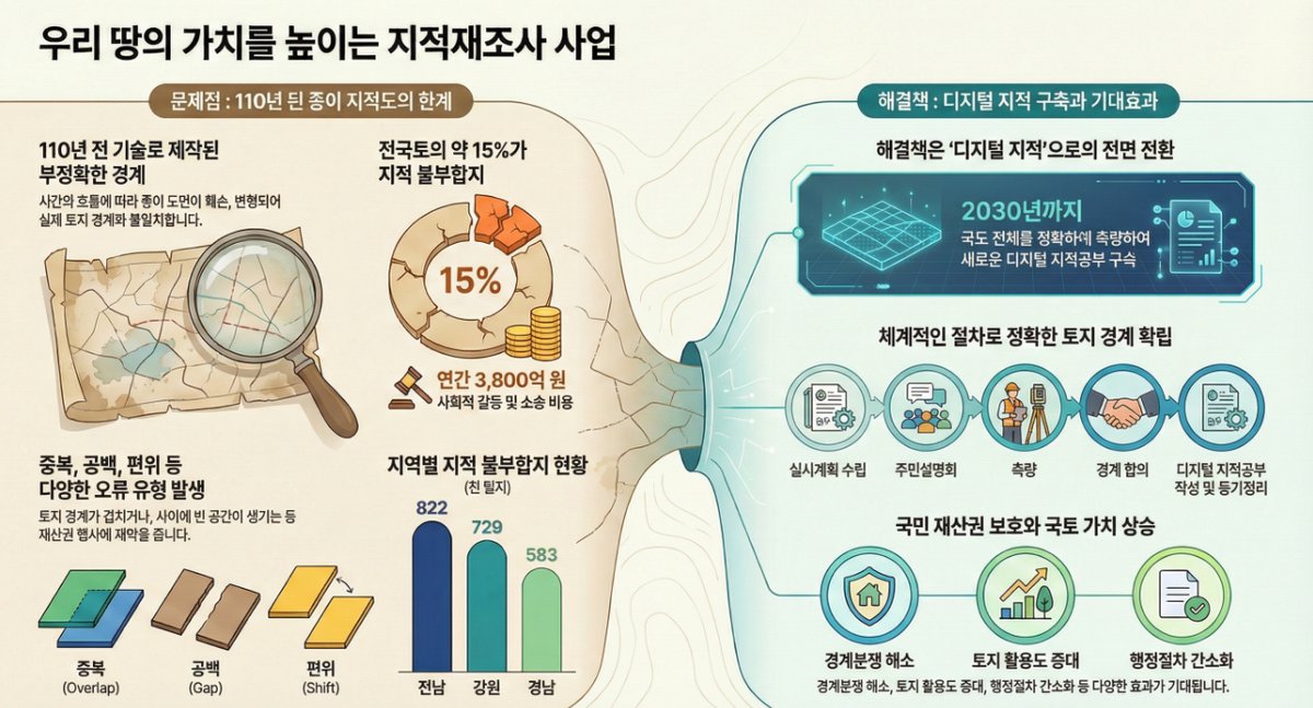 지적재조사사업은 일제강점기에 작성된 종이 지적도를 디지털 지적으로 전환하고 실제 토지 이용 현황과 맞지 않는 경계를 바로잡기 위해 추진되는 국가사업으로 토지 경계 분쟁 해소와 시민 재산권 보호에 중요한 역할을 하고 있다.