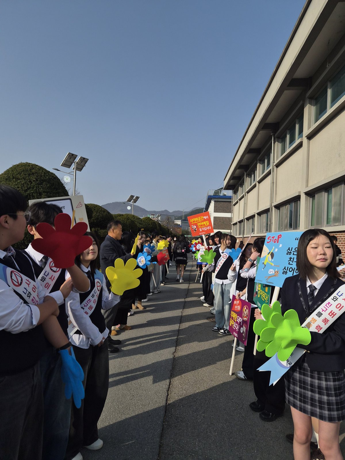 학생자치회 학생들은 피켓과 현수막을 활용해 등교하는 학생들을 맞이하며 안전한 등굣길 조성을 위한 메시지를 전달했고 밝은 인사와 함께 참여형 캠페인을 운영해 행사 분위기를 한층 활기차게 만들었다.