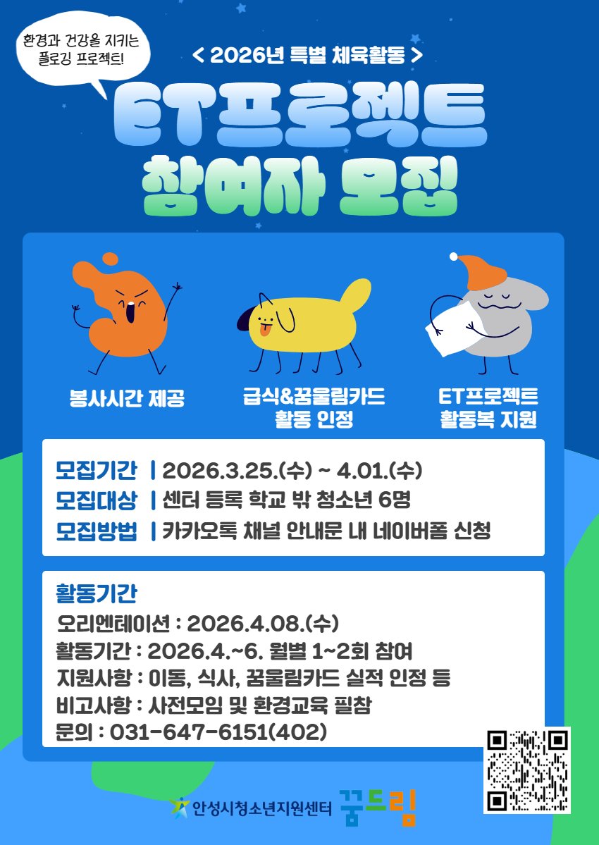 신청대상은 안성시 꿈드림에 등록된 학교 밖 청소년이며 신청은 네이버폼 또는 배포된 QR코드를 통해 간편하게 접수할 수 있다.