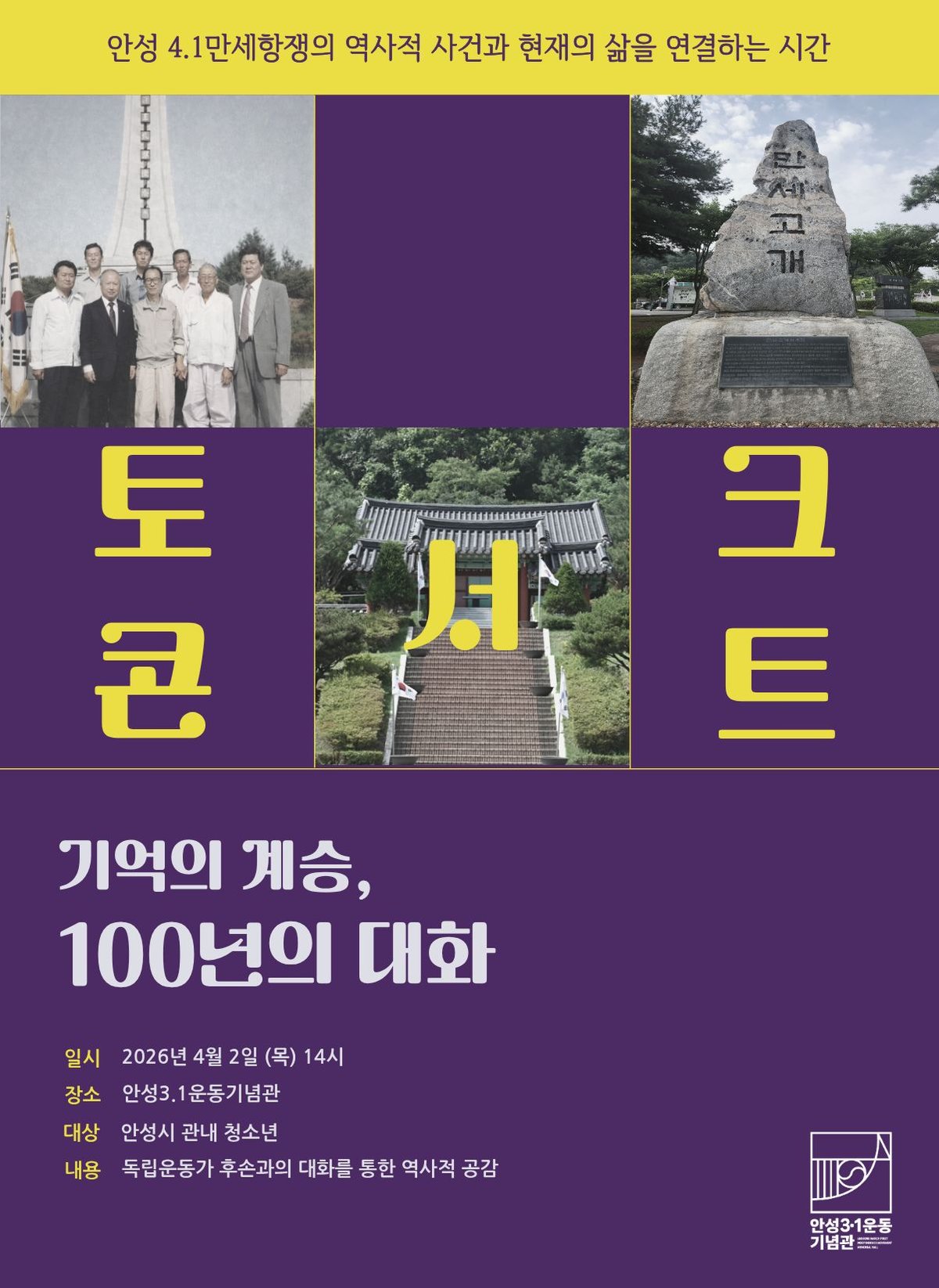 토크 콘서트에서는 이종우 회장이 독립운동가 이진영 선생님의 4 1만세항쟁 참여 과정과 서대문형무소의 수감 생활, 이후 독립운동가 후손들의 삶을 직접 들려주며 학생들과 질의응답을 나눈다.