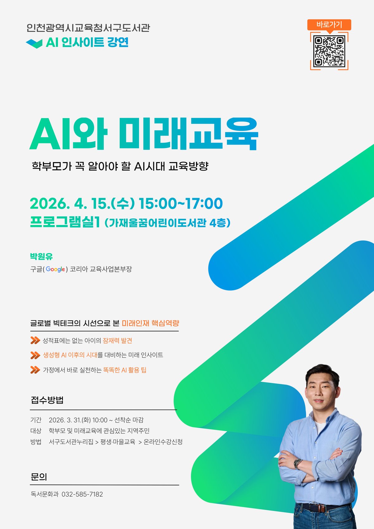 [충청뉴스큐] 인천광역시교육청서구도서관은 오는 31일부터 지역 주민을 대상으로 ‘AI와 미래교육’특별 강연 참여자를 모집한다.