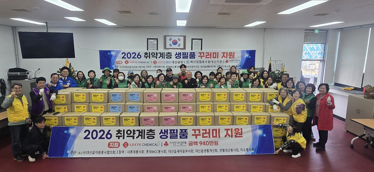 '취약계층 생필품 꾸러미'는 롯데케미칼과 충남사회복지공동모금회의 지원을 바탕으로 롯데MCC, 예선업협동조합 대산지부의 정기적인 후원 통해 마련했다.