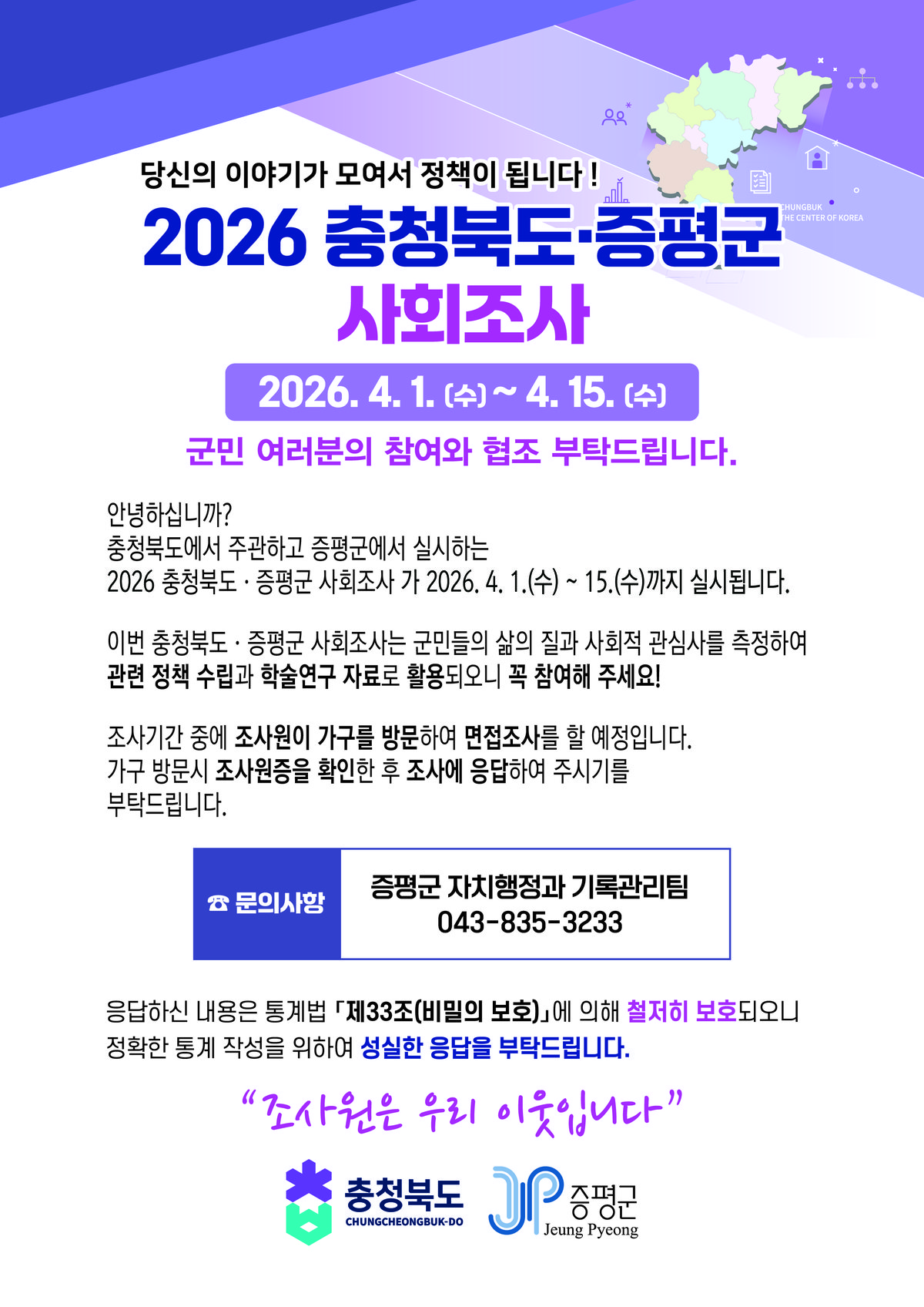 [충청뉴스큐] 충북 증평군은 오는 4월 1일부터 15일까지 군민의 생생한 목소리를 담아내는 ‘2026 사회조사’를 실시한다고 밝혔다.