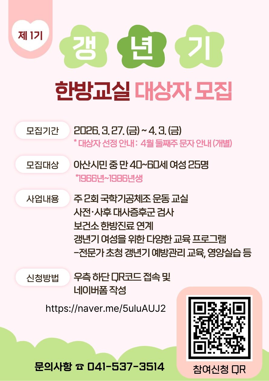 [충청뉴스큐] 아산시보건소에서 갱년기 예방 및 건강관리를 지원하기 위해 ‘제1기 갱년기 생기가득 한방교실’ 참여자를 3월 27일부터 4월 3일까지 모집한다.