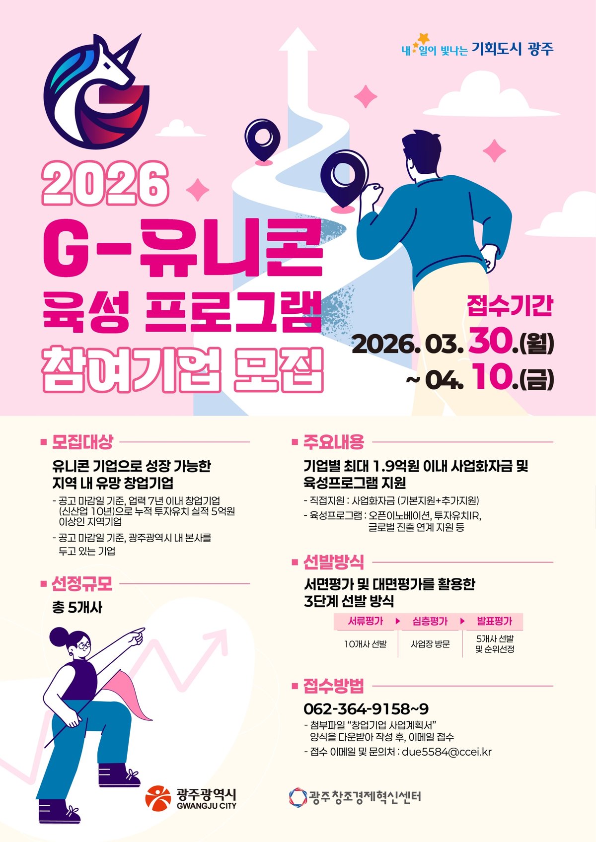 [충청뉴스큐] 광주광역시는 지역 내 혁신기술을 보유한 창업기업을 발굴해 세계적 경쟁력을 갖춘 유니콘 기업으로 키우기 위한 ‘지-유니콘 육성 프로그램’ 참가 기업을 오는 4월10일까지 모집한다.