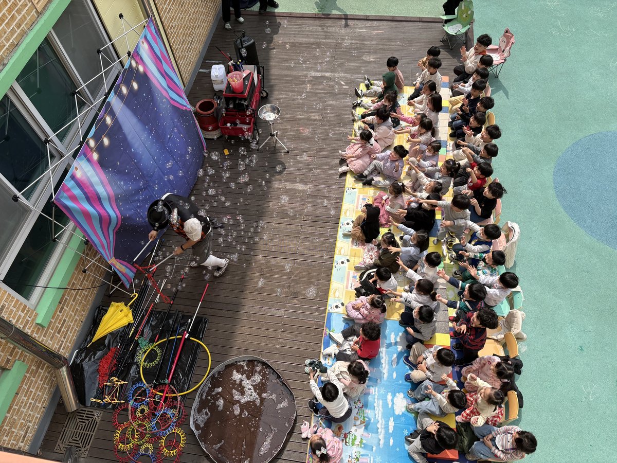 버블쇼 공연에서는 크고 작은 비눗방울, 연기를 담은 신기한 비눗방울, 다양한 도구를 활용한 퍼포먼스가 펼쳐졌으며 유아들은 눈앞에서 변화하는 비눗방울의 모양과 크기를 관찰하며 즐거운 시간을 보냈다.