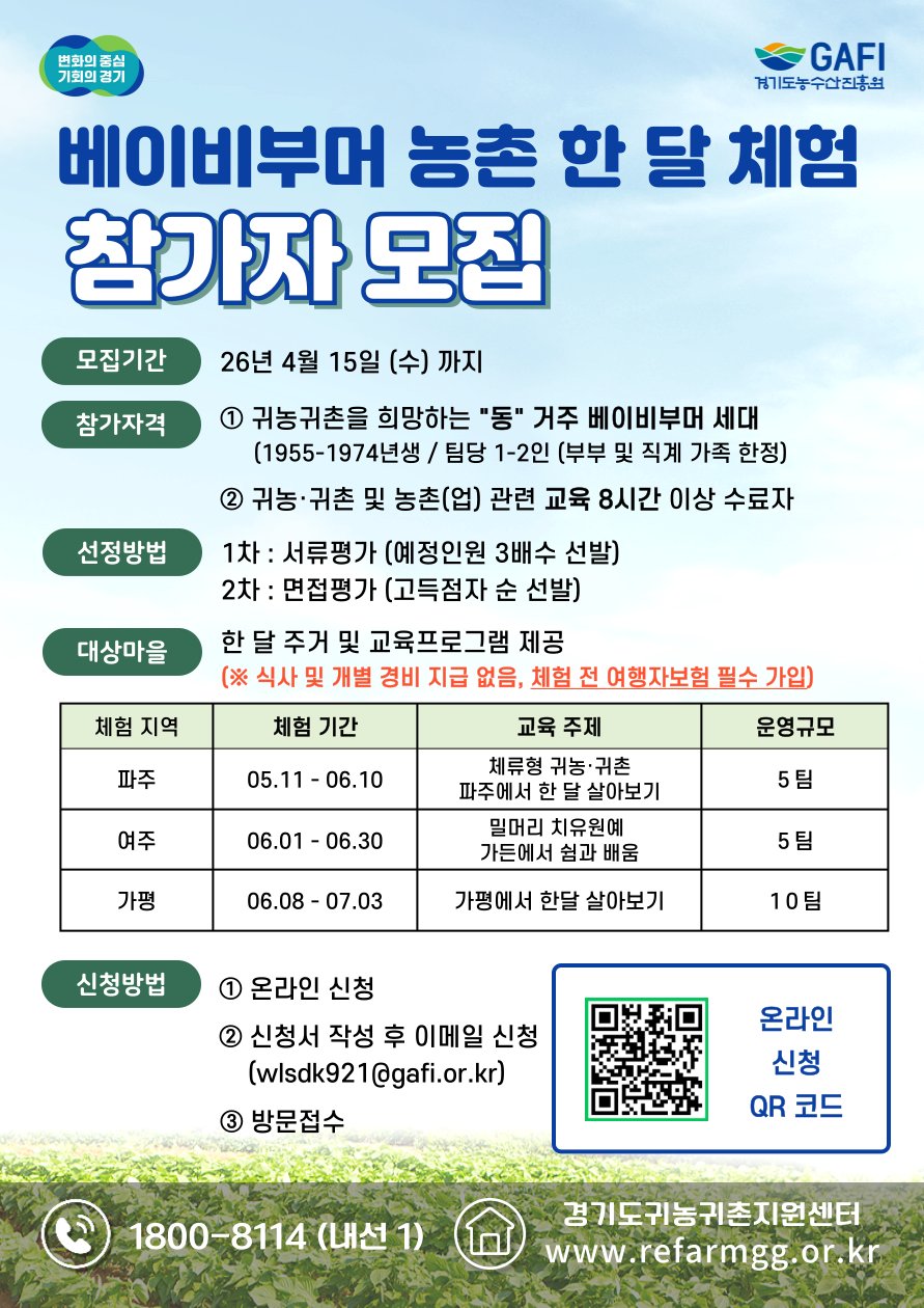 [충청뉴스큐] 경기도농수산진흥원은 오는15일까지 베이비부머 세대를 대상으로 농촌한 달 살기 프로그램 참가자를 모집한다.