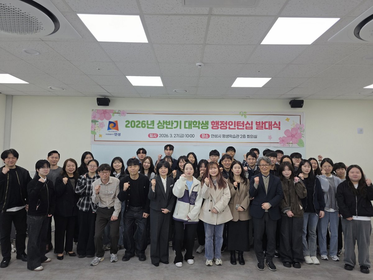 [충청뉴스큐] 안성시는 지난 27일 안성시 평생학습관 회의실에서 관내 대학생들과 공직자가 함께 시정 발전을 도모하는 ‘2026년 상반기 대학생 행정인턴십 발대식’을 개최했다.