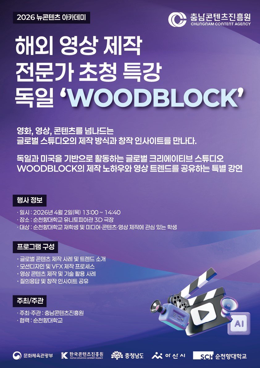 [충청뉴스큐] 충남콘텐츠진흥원은 오는 4월 2일 순천향대에서 '2026 뉴콘텐츠 아카데미'의 일환으로 글로벌 콘텐츠 제작 전문가 초청 특강을 개최한다고 밝혔다.