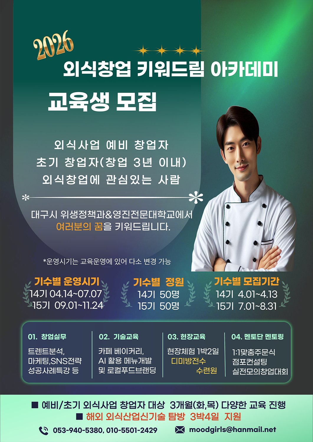 노권율 대구광역시 위생정책과장은 “이번 외식창업 ‘키워드림’아카데미가 침체된 지역경제에 새로운 활력을 불어넣길 기대한다”며 “내실 있는 교육과정 운영을 통해 실패를 최소화하는 창업 생태계를 조성하고 대구 외식업계가 지속 가능한 성장을 이어갈 수 있도록 적극 지원하겠다”고 말했다.