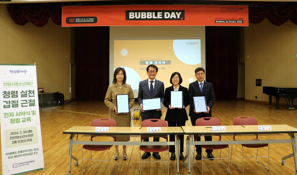 [충청뉴스큐] 안양시청소년재단, 내부 커뮤니케이션 행사 '버블데이'개최 청렴 서약식 및 청렴 교육 운영 안양시청소년재단은 지난 30일 만안청소년수련관 도담소극장에서 전 직원을 대상으로 내부 커뮤니케이션 행사 '버블데이'를 운영하며 조직 소통과 청렴문화 확산에 나섰다.