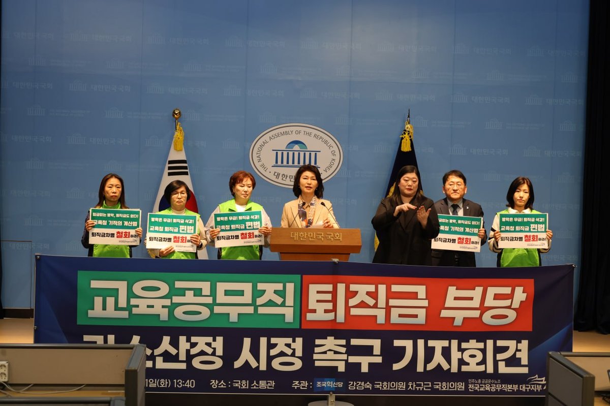 [충청뉴스큐] 조국혁신당 강경숙, 차규근 국회의원과 전국교육공무직본부는 2026년 3월 31일 국회 소통관에서 조국혁신당 강경숙 국회의원과 함께 교육공무직 퇴직금 부당 과소산정 시정촉구 기자회견을 개최했다.