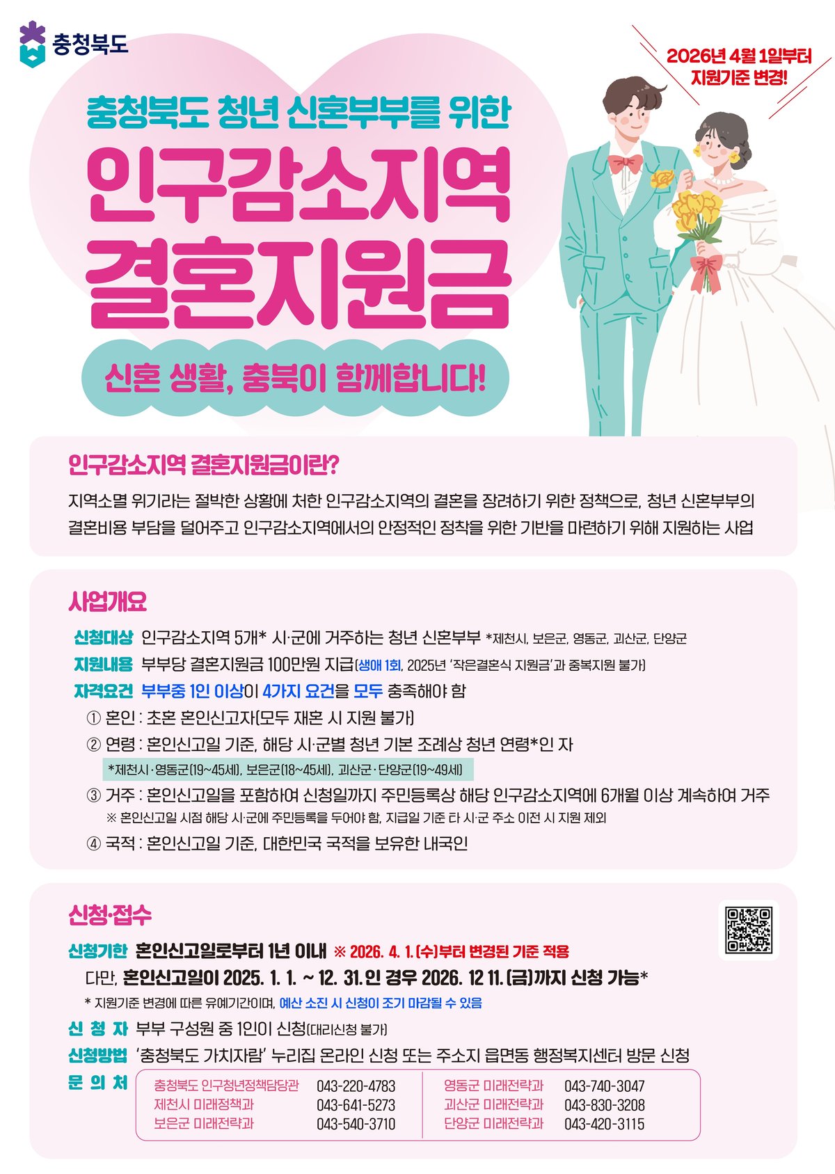 [충청뉴스큐] 충북도는 도내 인구감소지역 청년 신혼부부의 안정적인 지역 정착을 지원하기 위해 추진 중인 ‘인구감소지역 결혼지원금’ 사업을 오는 4월 1일부터 전격 개편 시행한다.