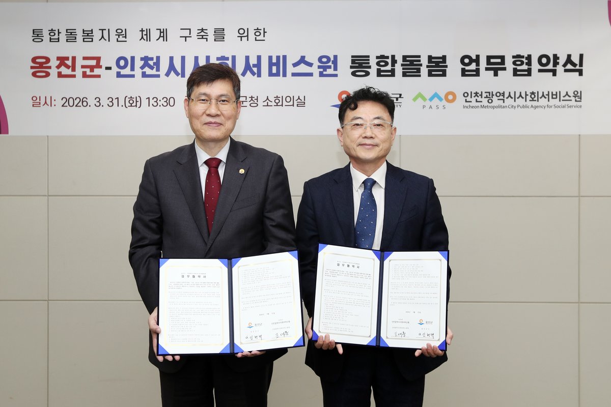 [충청뉴스큐] 인천시사회서비스원은 최근 '의료 및 요양 등 지역 돌봄의 통합지원에 관한 법률'시행에 따라 옹진군과 통합돌봄지원체계 구축 업무협약을 했다고 1일 밝혔다.