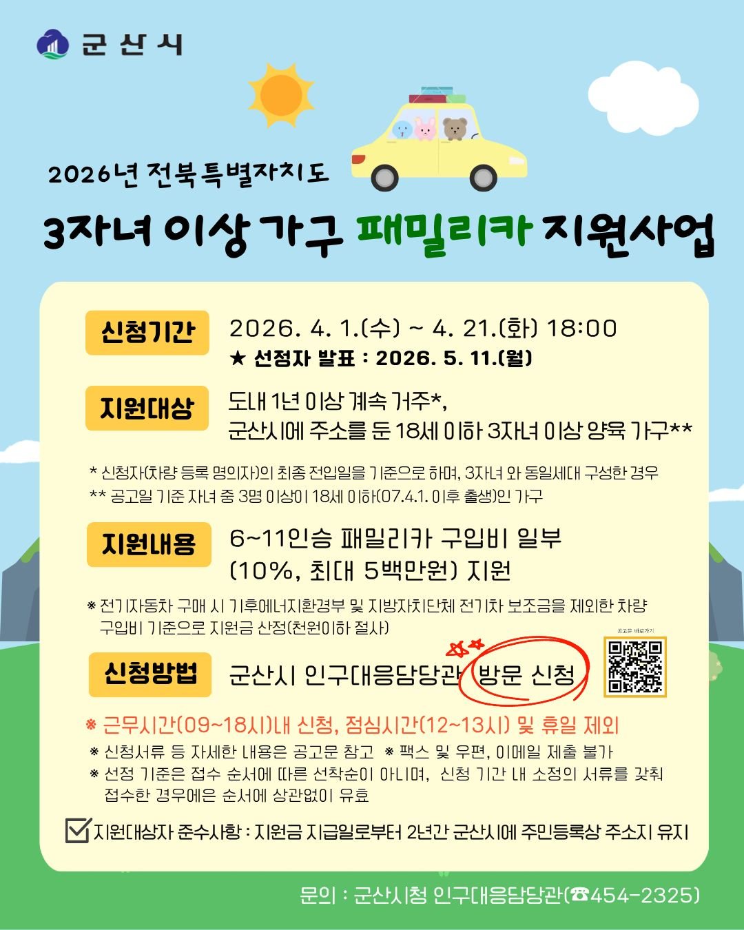[충청뉴스큐] 군산시는 다자녀 가구의 경제적 부담을 완화하고 이동 편의를 제공해 저출생 위기를 극복하고자 ‘2026년 전북특별자치도 3자녀 이상 가구 패밀리카 지원사업’ 참여자를 모집한다고 밝혔다.