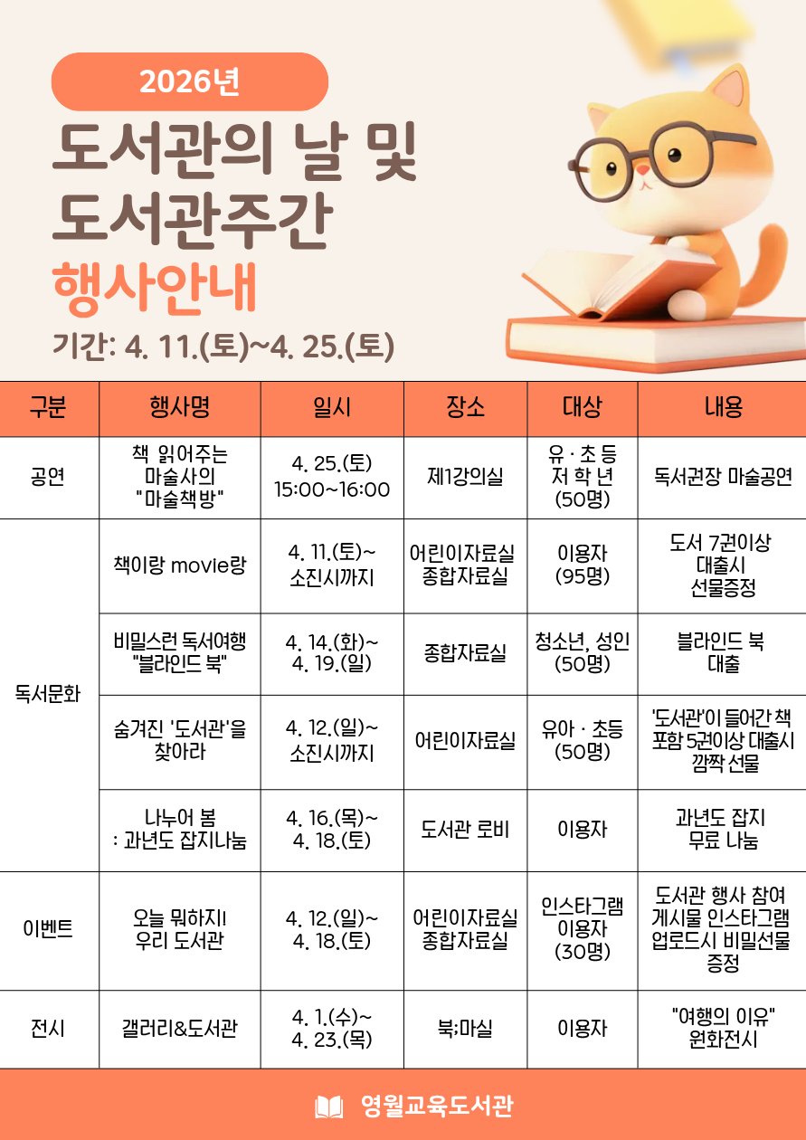 본 행사는 '도서관 속 작은 펼침, 세상을 여는 큰 그림'이라는 주제로 독서권장 공연 '책 읽는 마술사의 마술책방'독서문화프로그램 '책이랑 무비랑''비밀스런 독서여행 블라인드 북 '등 총 7개 프로그램을 진행한다.