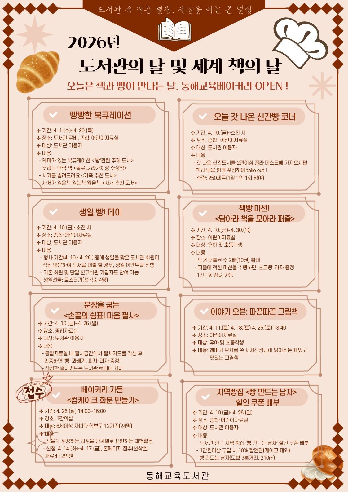 [충청뉴스큐] 동해교육도서관은 4월 12일 도서관의 날과 4월 23일 세계 책의 날을 맞아 '오늘은 책과 빵이 만나는 날, 동해교육베이커리 오픈'을 주제로 지역주민과 함께하는 독서문화 행사를 운영한다.