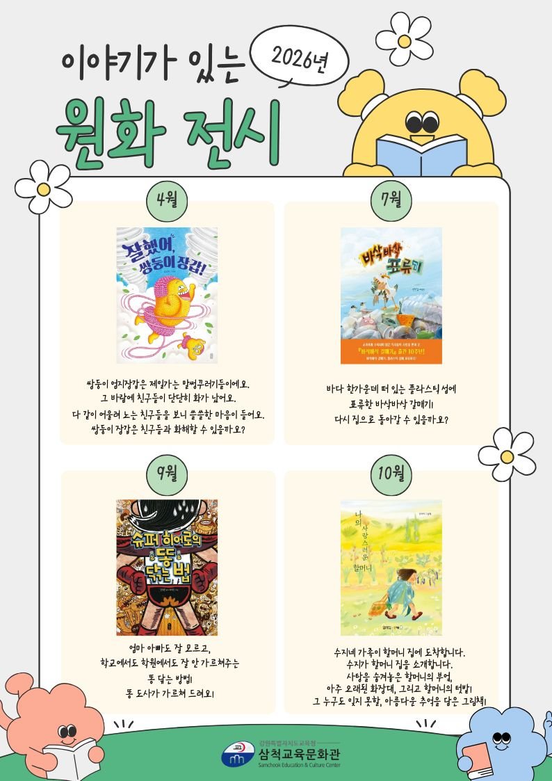 [충청뉴스큐] 삼척교육문화관은 4월부터 10월까지 어린이와 가족이 그림책 원화를 통해 독서의 즐거움을 느낄 수 있도록 총 4회에 걸쳐 '이야기가 있는 원화 전시'를 운영한다.