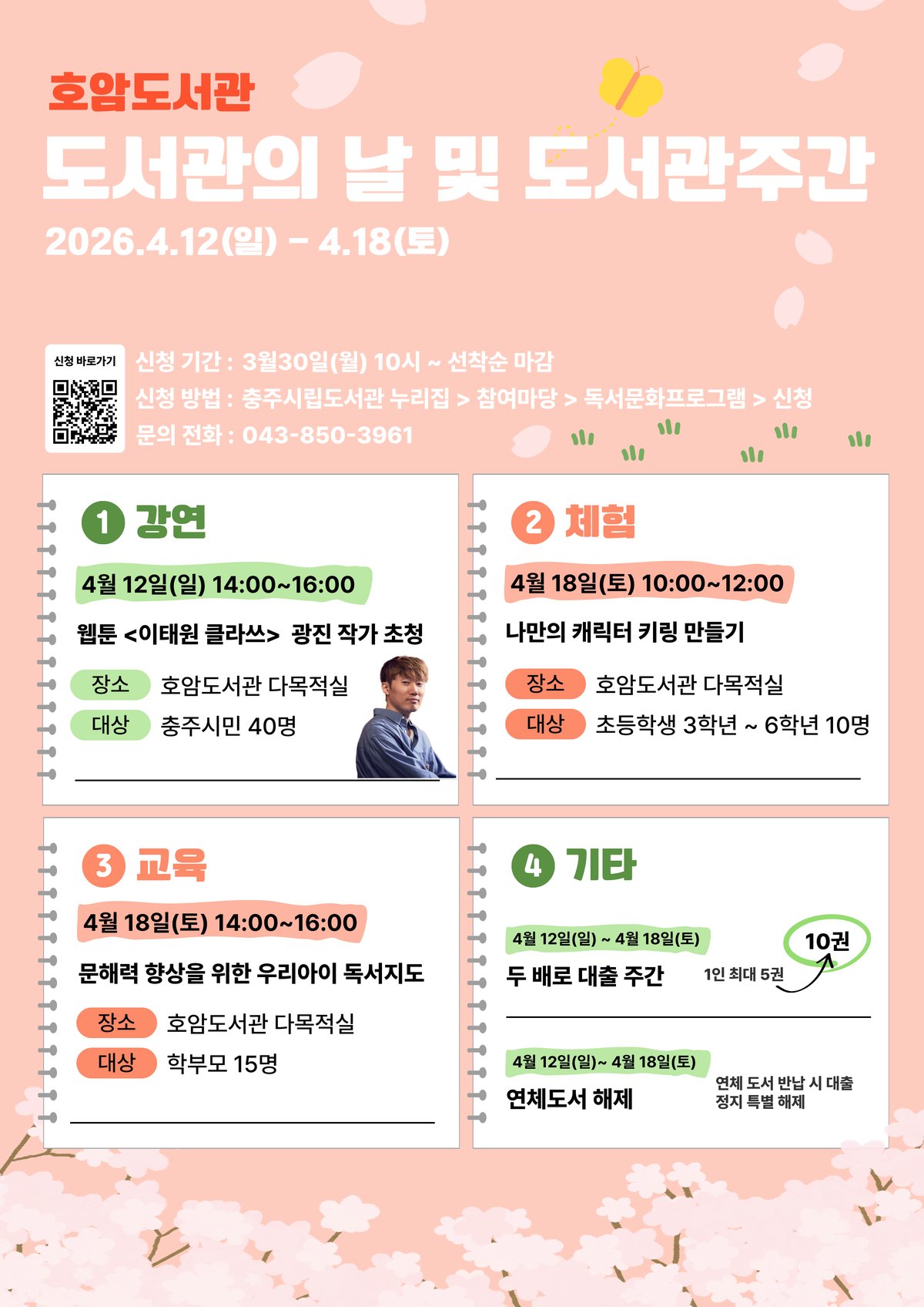 [충청뉴스큐] 충주시 호암도서관은 제4회 ‘도서관의 날’과 제62회 ‘도서관주간’을 맞아 4월 12일부터 18일까지 7일간 다채로운 독서문화 행사를 운영한다고 2일 밝혔다.