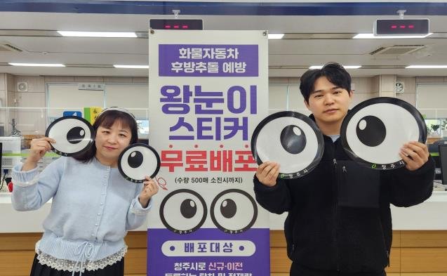 [충청뉴스큐] 청주시 차량등록사업소가 화물자동차 교통사고 예방을 위해 ‘왕눈이 스티커’를 제작 배포하고 있다.