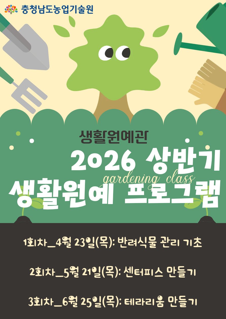 [충청뉴스큐] 충남도 농업기술원은 도민의 생활 속 식물문화 확산을 위해 ‘2026년 상반기 생활원예 프로그램’일반인 과정 참여자를 모집한다고 2일 밝혔다.