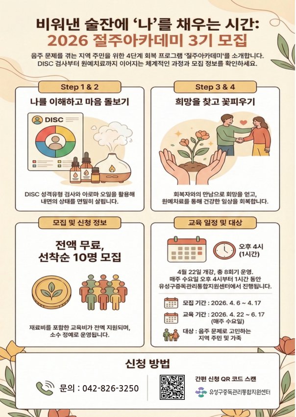 정용래 유성구청장은 "이번 절주아카데미가 술로 인해 일상의 어려움을 겪는 주민이 자신을 돌아보고 가족 공동체를 회복하는 계기가 되길 바란다"라며 "앞으로도 주민이 건강하고 행복한 일상을 되찾을 수 있도록 지원하겠다"라고 말했다.