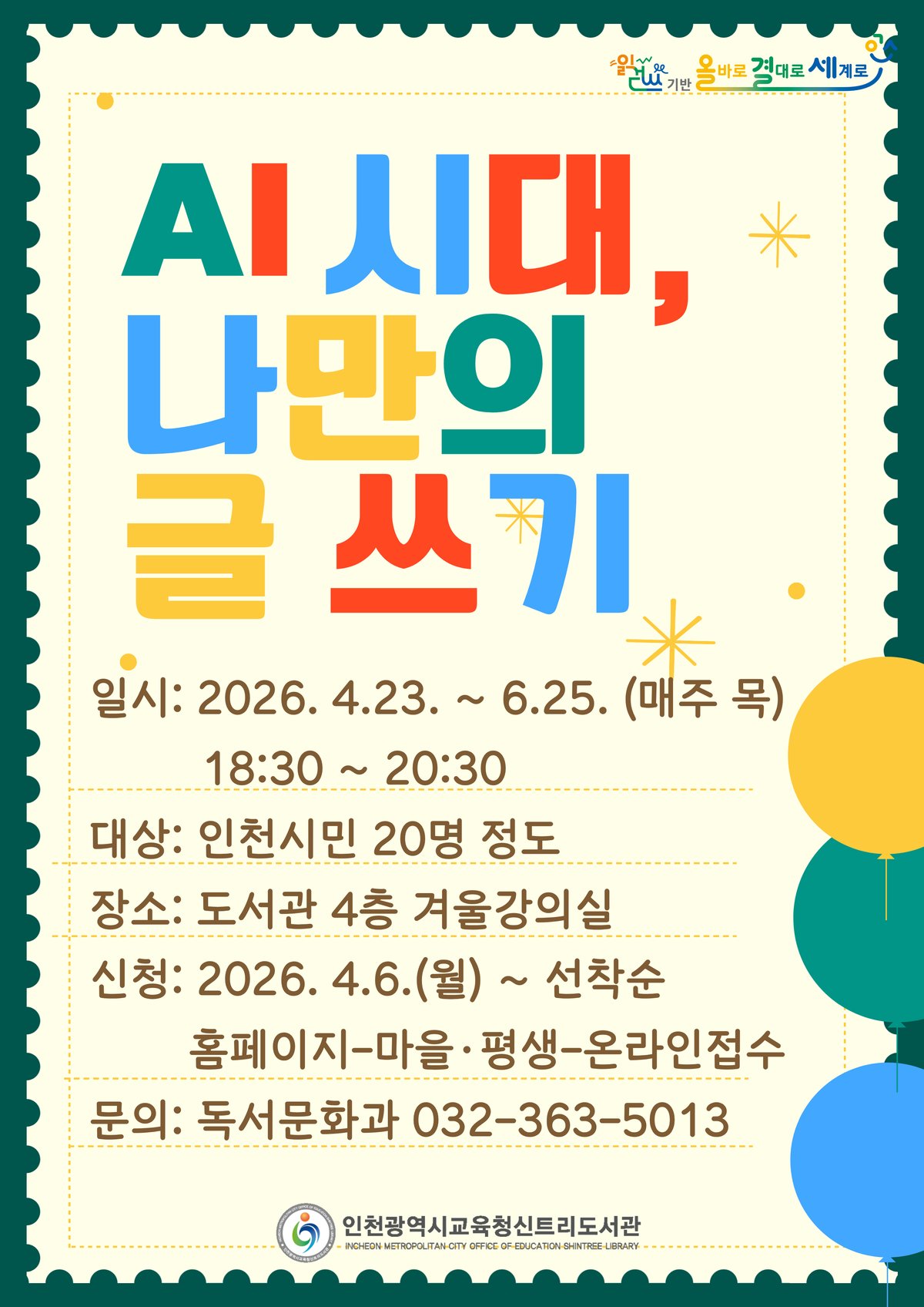 [충청뉴스큐] 인천광역시교육청신트리도서관은 인공지능 시대에 발맞춰 시민의 창의적 글쓰기 역량 강화를 위해 오는 23일부터 ‘AI 시대, 나만의 글쓰기’ 프로그램을 운영한다.